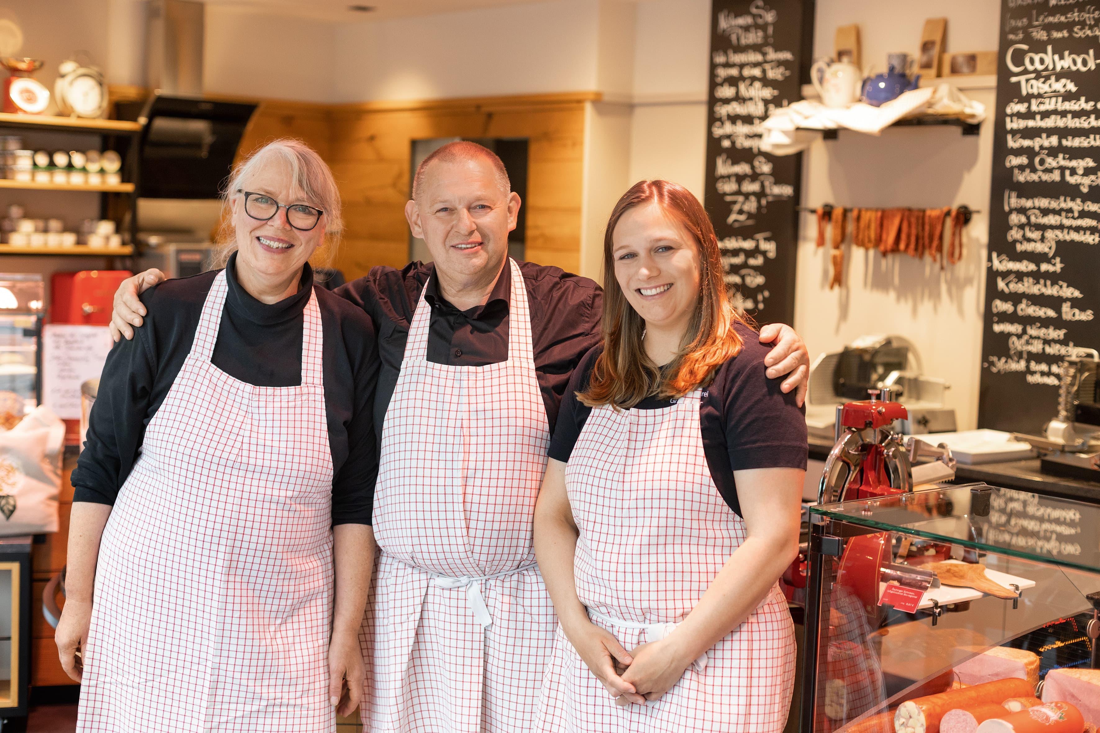 Manuela Grießhaber, Senior Karl-Heinz Grießhaber und Inhaberin Desirée Grießhaber-Vetter (v. l. n. r.) setzen auf höchste Tierwohlstandards und traditionelles Metzgerhandwerk.