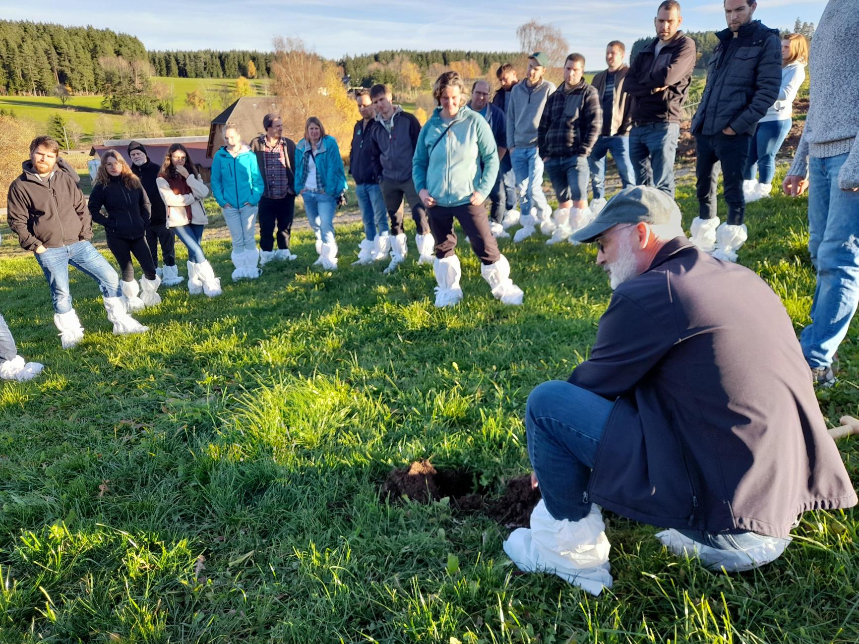 Bioland-Berater Martin Weiß (rechts) führt mit den Teilnehmenden eine Spatendiagnose auf dem Acker des Betriebs Gerhard Klausmann durch.