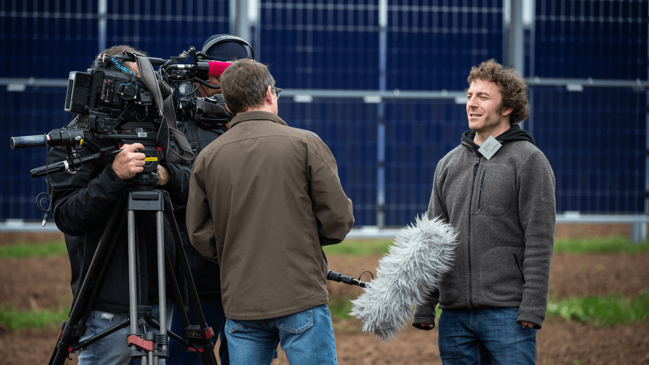 Projektkoordinator Corbinian Schöfinius vor den vertikalen Photovoltaik-Modulen bei der offiziellen Projektvorstellung am 22. Oktober 2025 in auf dem Acker von Bioland-Betrieb LohmannsHof in Dörverden.
