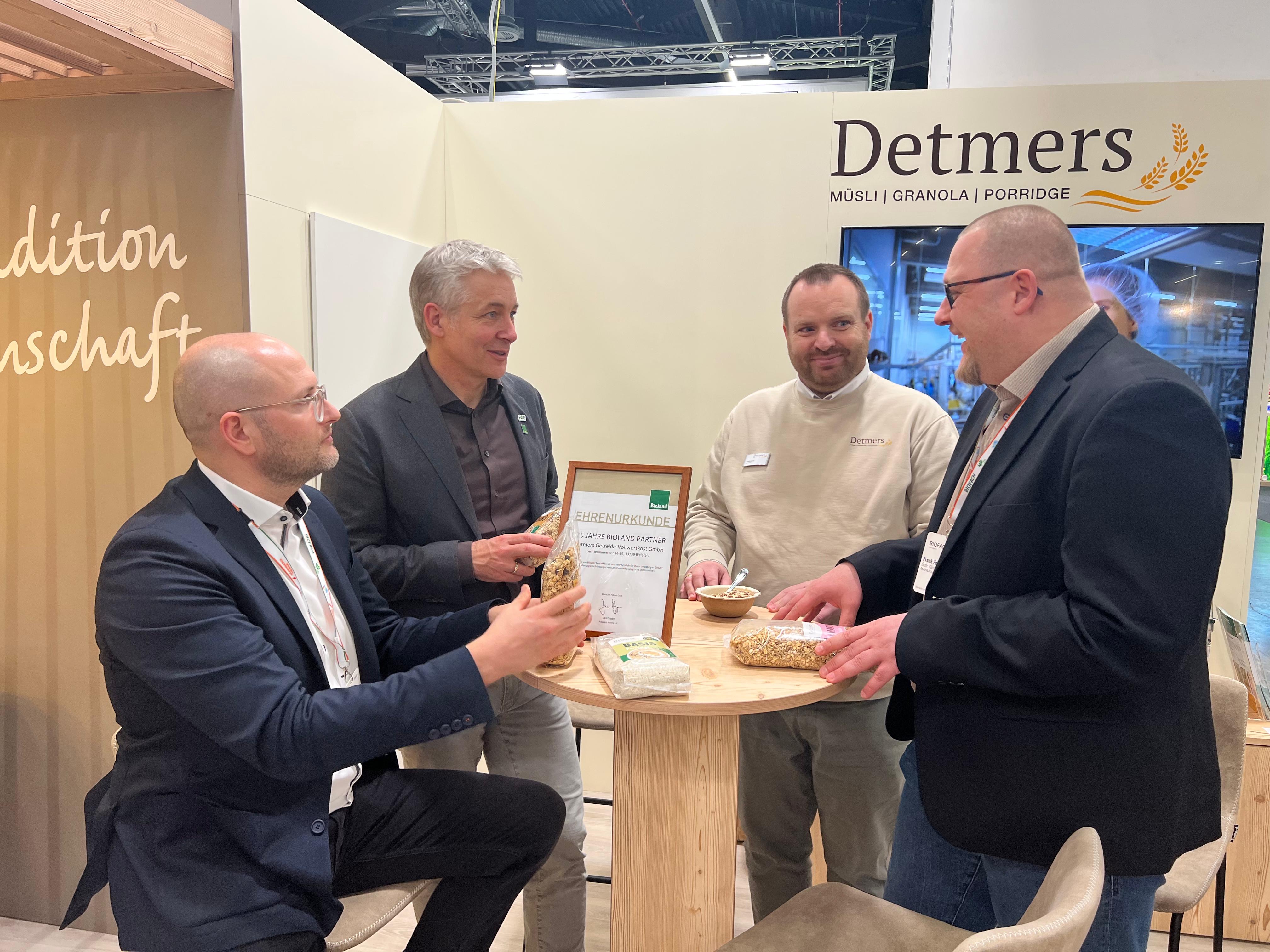 Neue Bioland-Müslis von Detmers auf der BIOFACH vorgestellt – Urkundenübergabe durch Bioland-Präsident Jan Plagge