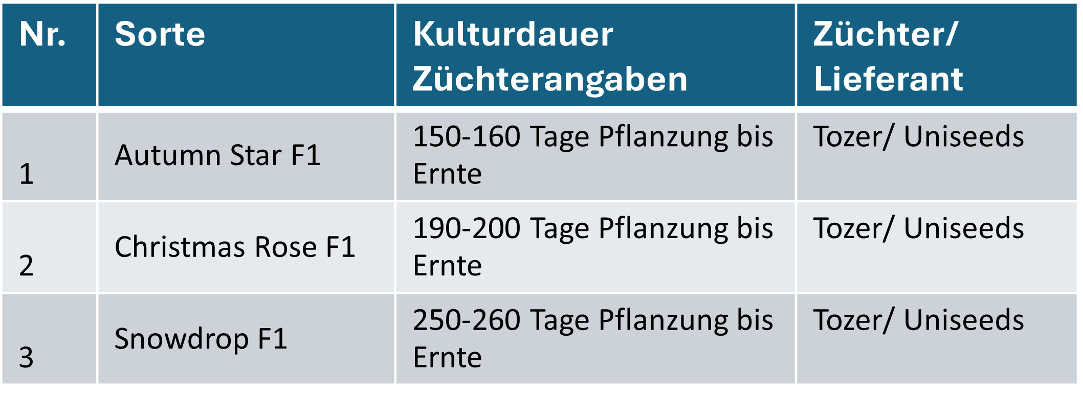 Im Jahr 2024/25 wurden drei verschiedene Flower Sprouts–Sorten in einem Versuch auf einem Praxisbetrieb auf Ertrag und optimale Erntezeitpunkten untersucht. Aufgrund der im Jahr 2024 eher kühlen und sehr feuchten Witterungsbedingungen zeigte sich eine sehr späte Entwicklung der Pflanzen und der Röschen.