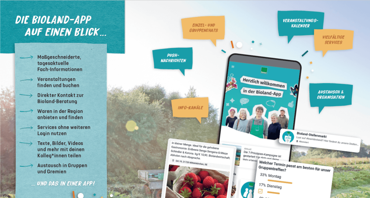 Die Bioland-App ist die neue digitale Plattform für Bioland-Erzeuger und -Partner. Sie bietet umfassende Funktionen von Information über Kommunikation bis Organisation.