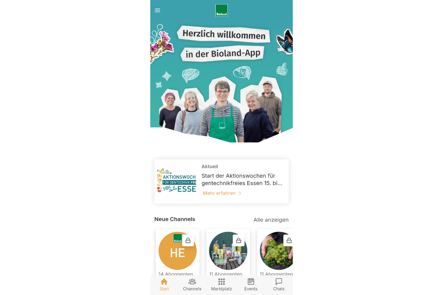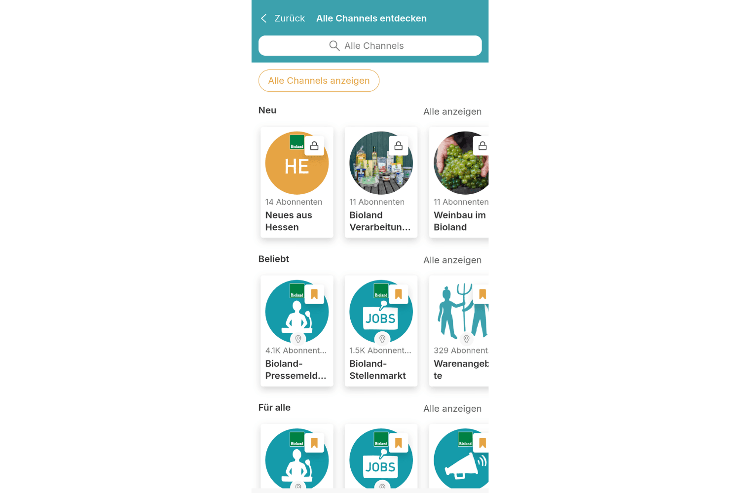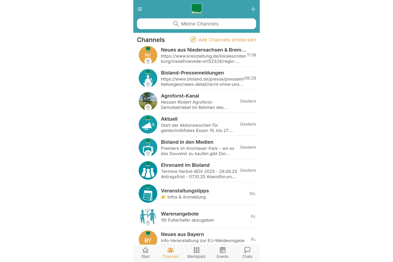 Danach dauert es einen kleinen Moment (in der Regel maximal eine Stunde), bis dir sämtliche Zugriffsrechte in der Bioland-App zugeordnet sind. Anschließend siehst du alle für dich relevanten Inhalte (z. B. geschlossene Channels, in denen du Mitglied bist).