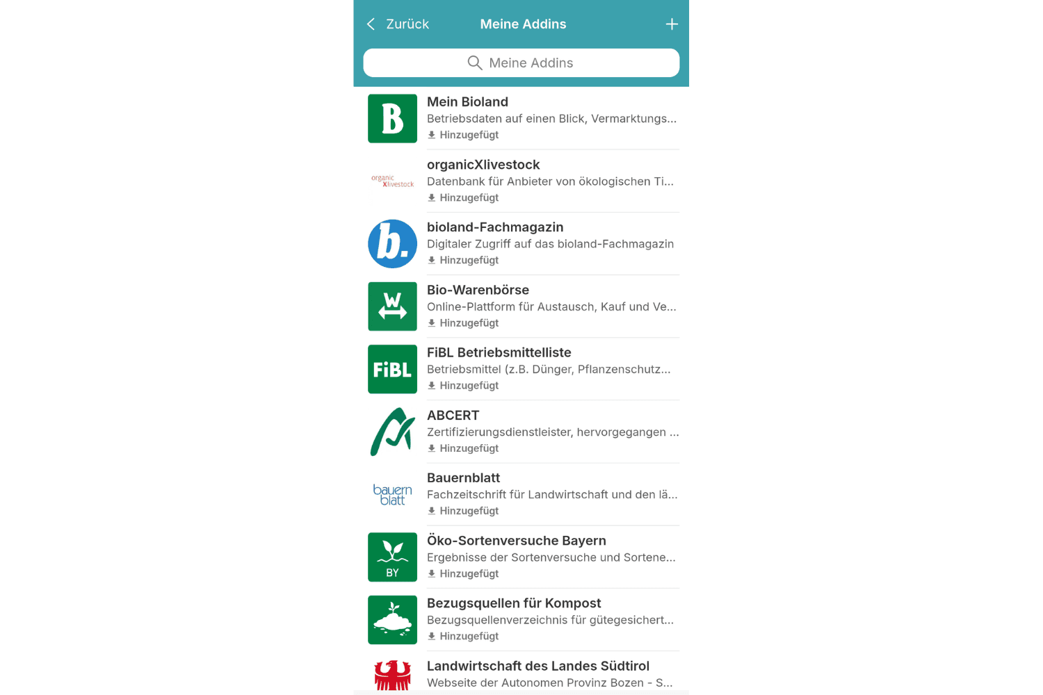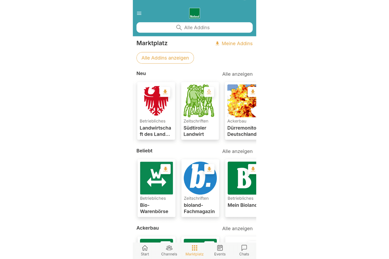 Der Marktplatz ist das Service-Portal zu relevanten Bioland-Anwendungen sowie externen Angeboten. Hier findest du sogenannte Addins, das sind Zusatzangebote, die du abonnieren kannst.