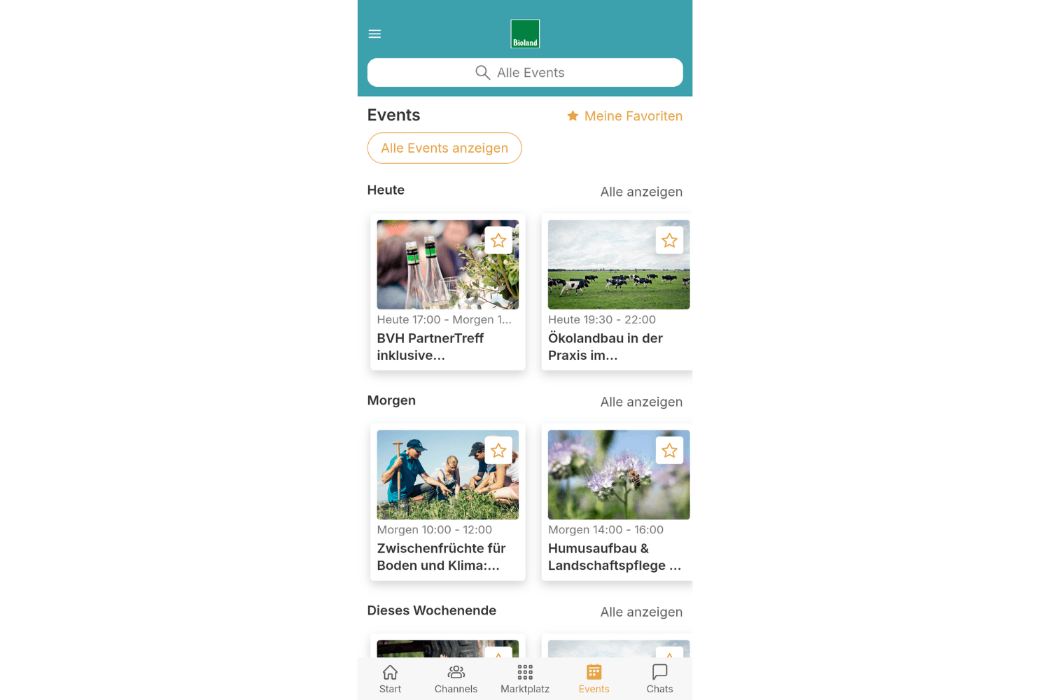 Im Bereich Events findest du Bioland-Veranstaltungen. In der ersten Ansicht sind sie nach Datum bzw. Kategorie sortiert (siehe Bild rechts).
