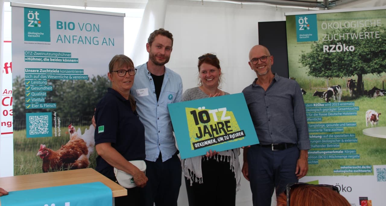 Als gelungenes Gemeinschaftswerk feierten die Gründer und Wegbegleiter die Ökologische Tierzucht (ÖTZ) bei den Öko-Feldtagen: Sabine Kabath für Bioland, Inga Günther-Bender und Carsten Scheper von der ÖTZ und Mitinitiator Alexander Gerber (von links). (Foto: Brigitte Stein)