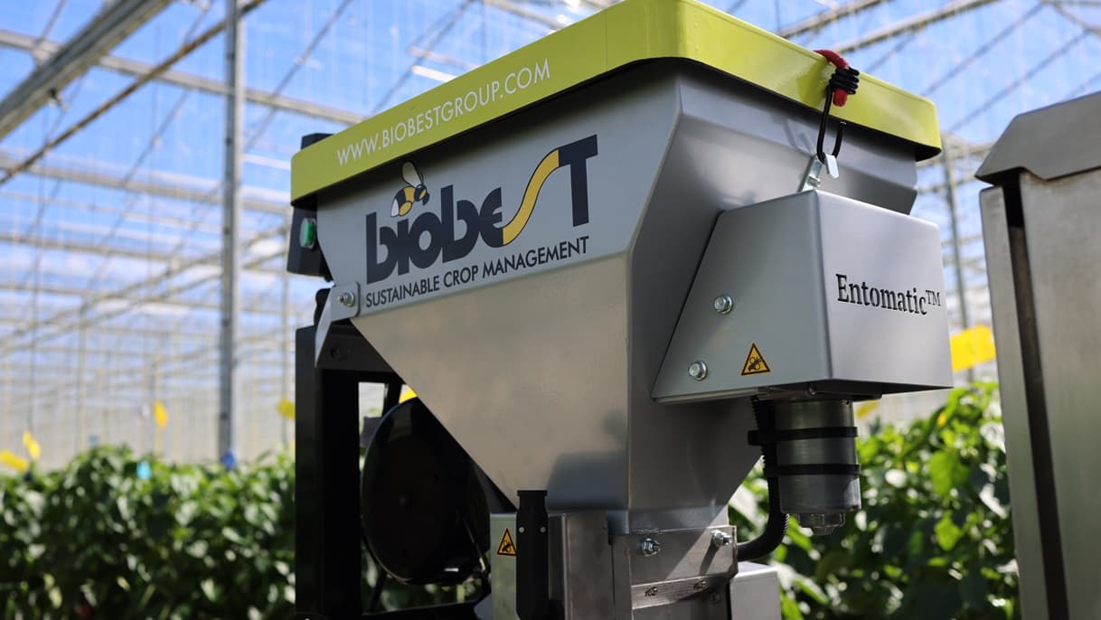 Mithilfe eines Luftstroms verteilt der neue Dispenser der Firma Biobest Nutzinsekten und Milben gleichmäßig über die Pflanzen im geschützten Anbau. Die Technik ist ein modular aufgebautes System und trägt den Namen Entomatic. Es besteht aus einer Dosiereinheit, einem Bedienfeld und Gebläsen. Der Vorratsbehälter kann verschiedene Trägermaterialien wie Vermiculit, Sägemehl, Kleie und Buchweizenschalen aufnehmen. Laut Biobest wird es in Gewächshäusern häufig auf Rohrschienenwagen montiert. Ein neues Plug-In kann nun den Dispenser mit dem Qii-Jet Sprühroboter der Firma Boagerts verbinden. So arbeiten der Entomatic und der Qii-Jet künftig zusammen.