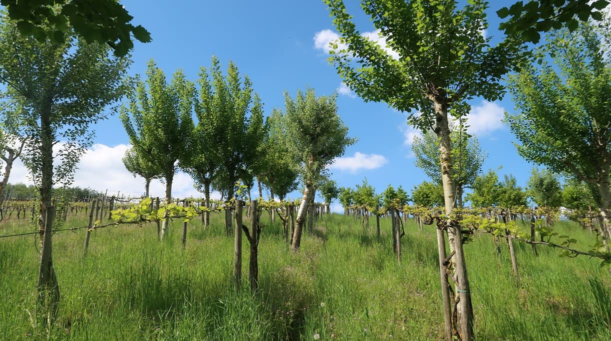 Pappel und Eiche ergänzen Riesling und Sauvignon Blanc. Forschende untersuchen Arbeitsaufwand, Qualität und Klimaschutz in Mischkulturen.