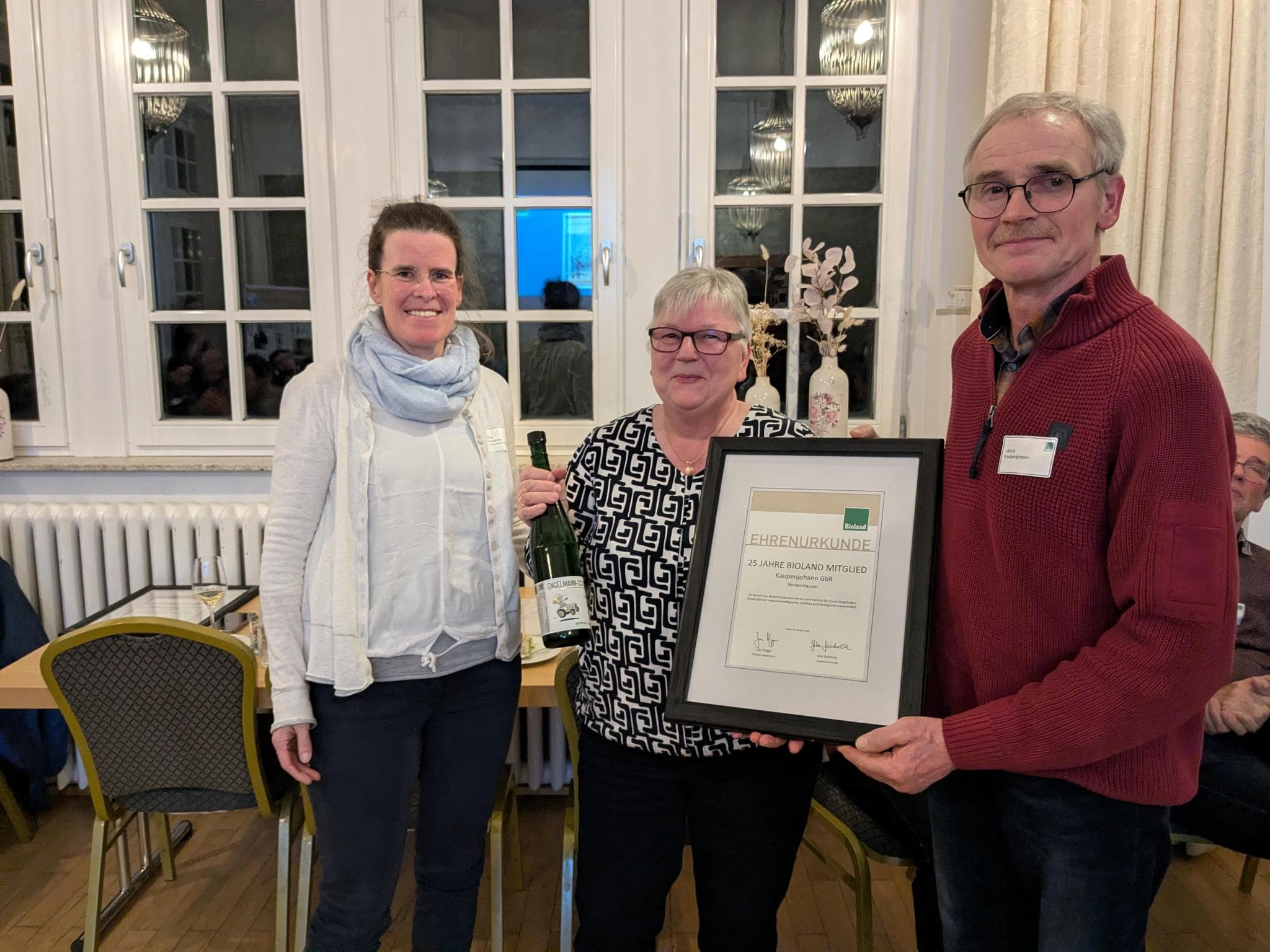 Gita Sandrock (links) ehrt Renate und Ulrich Kaupenjohann für 25 Jahre Mitgliedschaft bei Bioland.