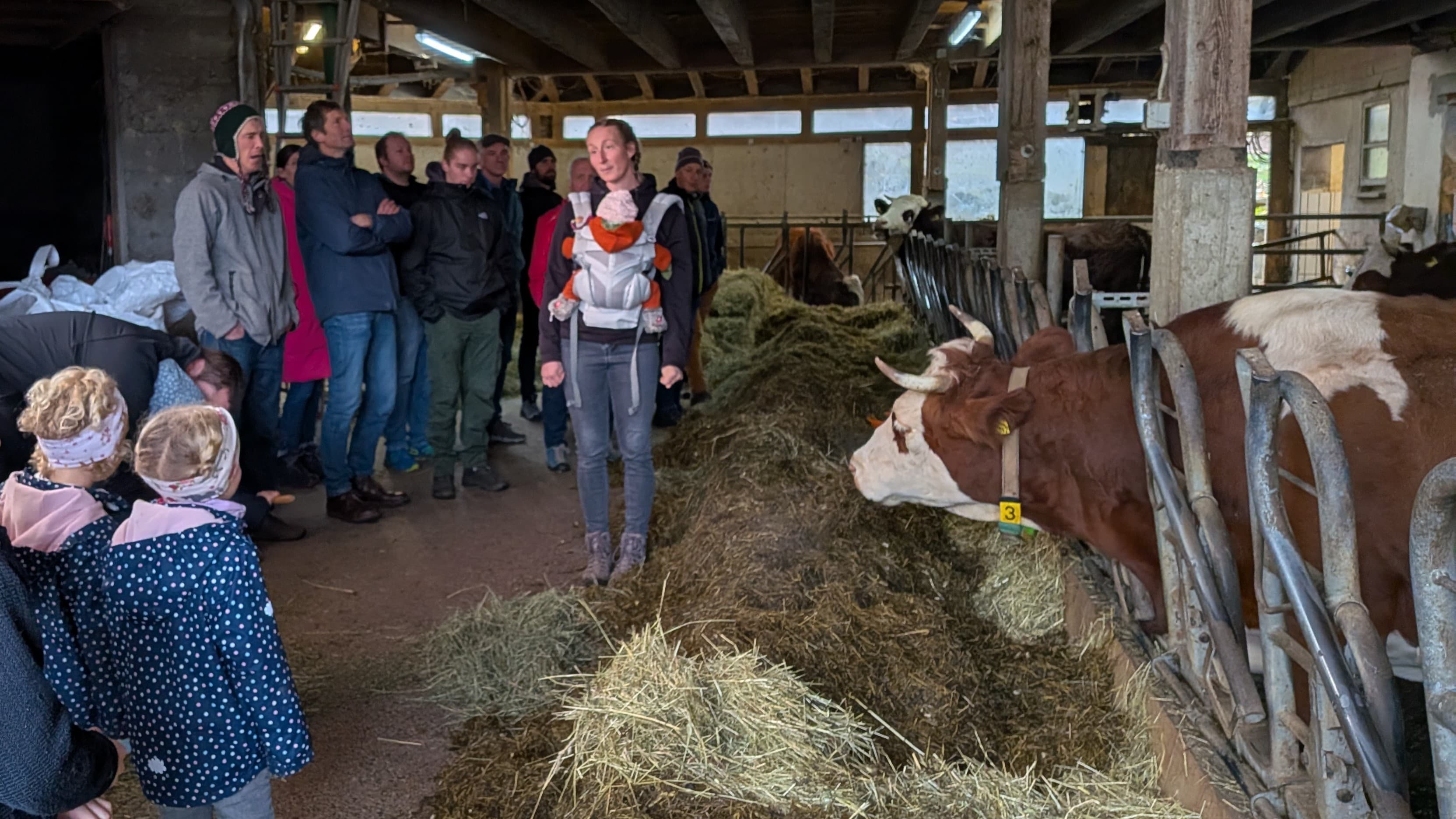 Der Tag startete mit einer Betriebsbesichtigung des Seppjockelshof von Sophia Kammerer in Furtwangen. Sie führte die Gruppe durch den Stall ihres Milchviehbetriebs, der schon seit mehreren Hundert Jahren in der Hand der Familie ist. Als junge Familie führen sie nun den Hof fort, der zusätzlich auch noch fünf Ferienwohnungen und Platz für Pensionspferde hat.