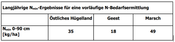 Für die Düngeplanung lassen sich die langjährigen durchschnittlichen N-Gehalte je Naturraum nutzen; Diese wurden kürzlich von der LKSH veröffentlicht. Weichen diese Werte um maximal +/- 10 kg N/ha von denen im Frühjahr 2026 vom Nitratmessdienst veröffentlichten Werten ab, muss die Düngebedarfsermittlung nicht mehr angepasst werden.