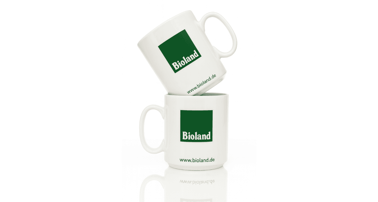 Porzellantassen – robust, klassisch und alltagstauglich. Perfekt für Hof, Laden oder Büro – und ein klarer Blickfang im Bioland-Design.