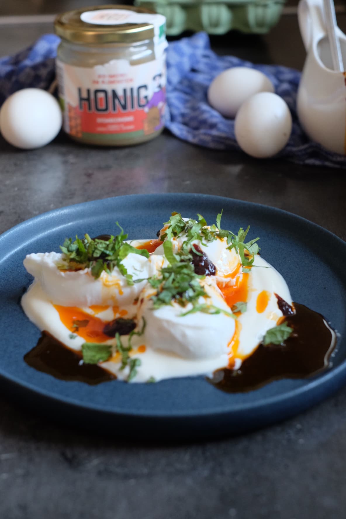 Auf einem großen Teller den Joghurt verstreichen, die Eier darauf platzieren, mit der Honig-Chili-Butter beträufeln und mit dem Kräuter-Mix und Salzflocken bestreuen. Angeröstetes Brot oder Baguette dazu servieren.