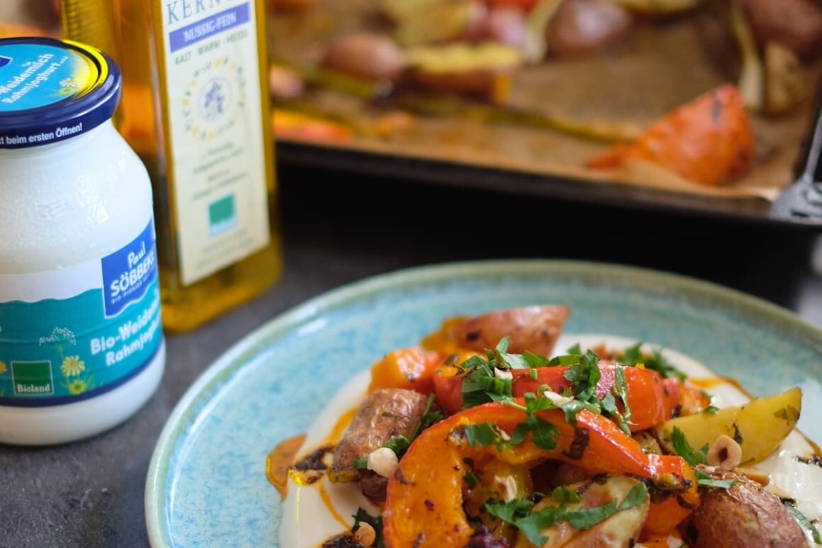 Auf einer großen Platte den Joghurt verstreichen, das Gemüse darauf türmen und mit der Honig-Chili-Butter beträufeln.