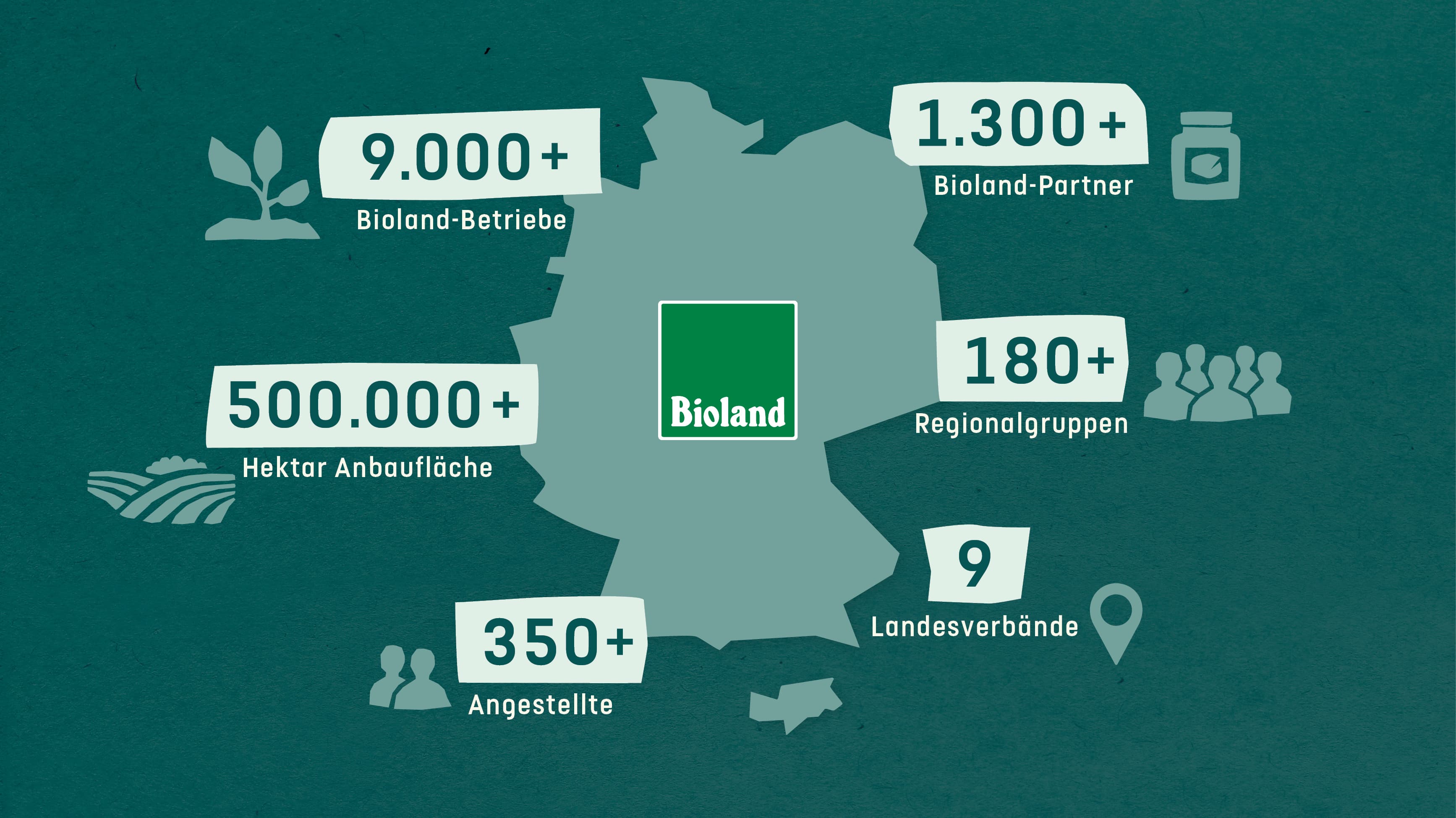 Im Verband haben sich eigenständige und unabhängige Betriebe aus der Land- und Lebensmittelwirtschaft zusammengeschlossen. Der Großteil, rund 9.000 Mitglieder, sind landwirtschaftliche Betriebe, von Ackerbau bis Weinbau, vom Bienenstock bis Hühnerstall. Knapp die Hälfte der deutschen Bio-Verbandsflächen werden von Bioland-Betrieben bewirtschaftet.